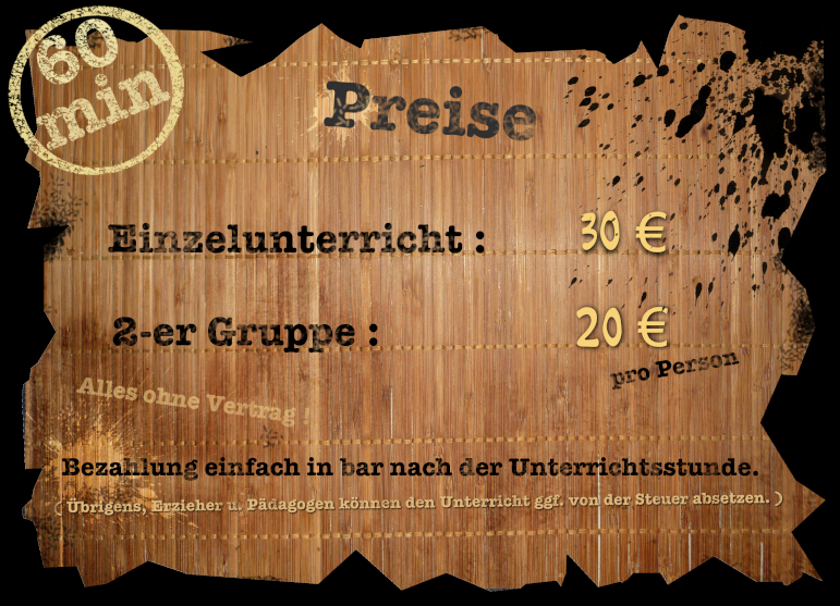 Alle Preise sind Endpreise. Gemäß § 19 (1) UStG wird keine Umsatzsteuer erhoben und daher auch nicht ausgewiesen. Die Preise gelten jeweils für 60 Minuten Unterricht. Eine Einzelstunde kostet 30€. Der Preis pro Person für eine Stunde in einer 2-er Gruppe beträgt 20€. Bezahlt wird einfach am Ende der Stunde. Nach Absprache kann auch eine andere Dauer für die Unterrichtseinheit vereinbart werden und somit ein anderer Preis zu Stande kommen. Gutscheine sind ebenfalls möglich. Alles ohne Vertragsbindung!